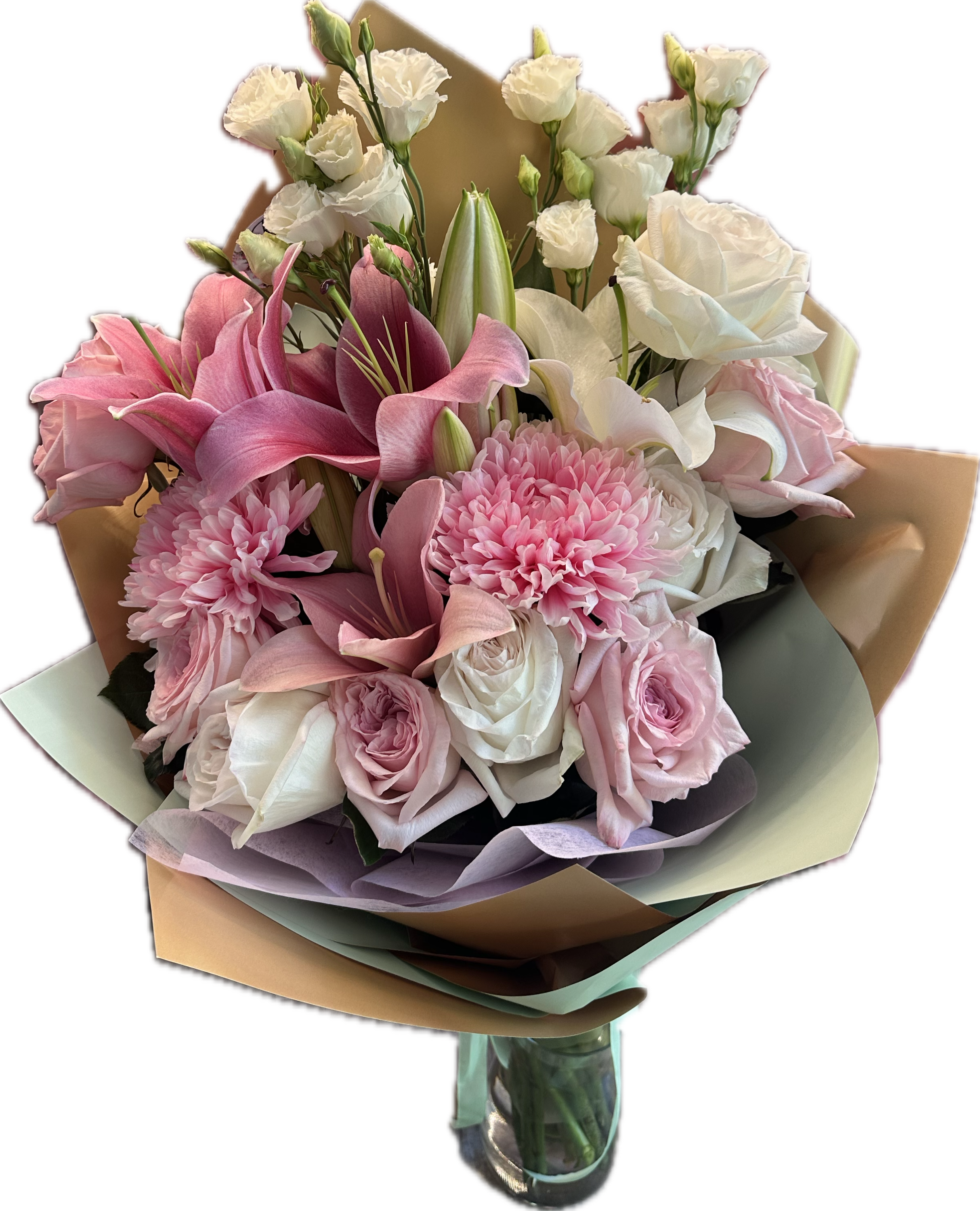 Lisianthus/trandafiri roz/alb/Crin regal Mărime : mare